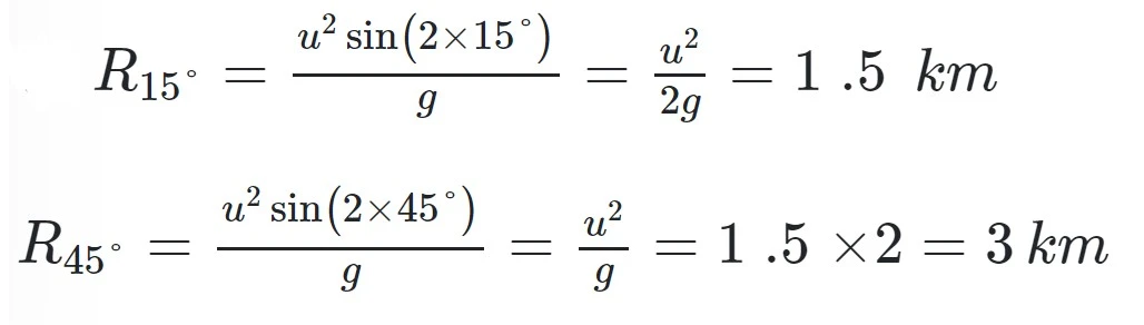5. The range of a particle when launched at an angle of 15° with the horizontal is 1.5 km. What is the range of the projectile when launched at an angle of 45° to the horizontal