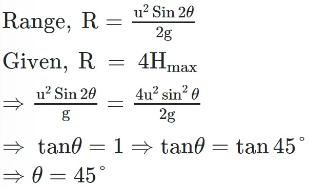 20. The horizontal range of a particle thrown from the ground is four times the maximum height. The angle of projection with the vertical is: