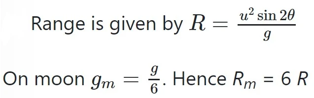 18. A projectile thrown with a speed v at an angle θ has a range R on the surface of earth. For same v and θ, its range on the surface of moon will be (acceleration due to gravity on moon= g/6