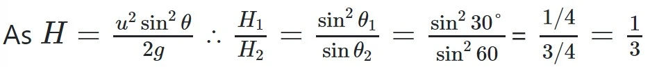 29. Two bodies are projected with the same velocity. If one is projected at an angle of 30° and the other at an angle of 60° to the horizontal, the ratio of the maximum heights reached is