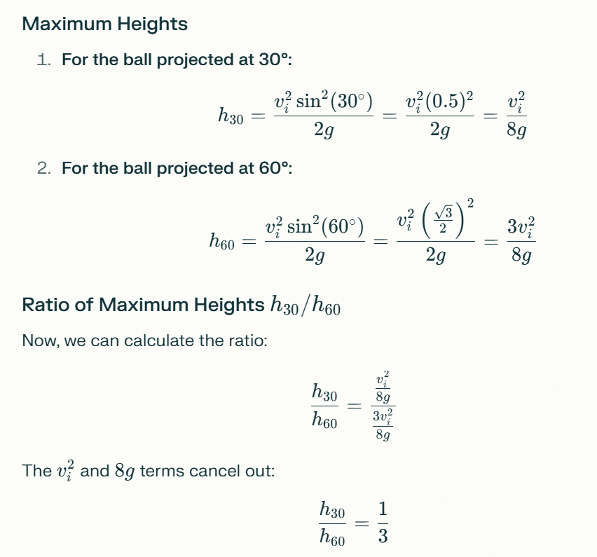 two balls projected at 30° and 60° with the same initial velocity the ratio of their maximum heights is